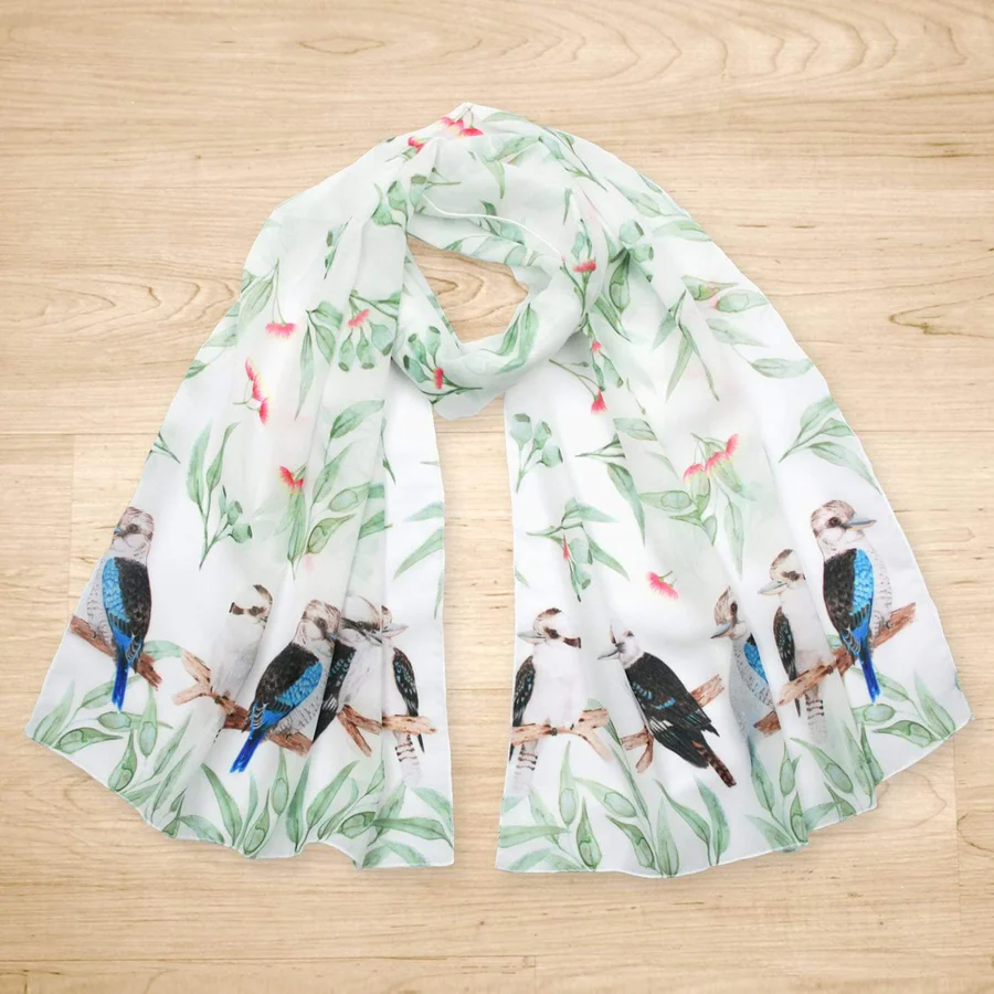This beautiful scarf print has been designed from hand painted watercolour art work of Australian Kookaburras with lovely pink Gum Blossom flowers. Featuring the Laughing and the Blue Winged Kookaburras