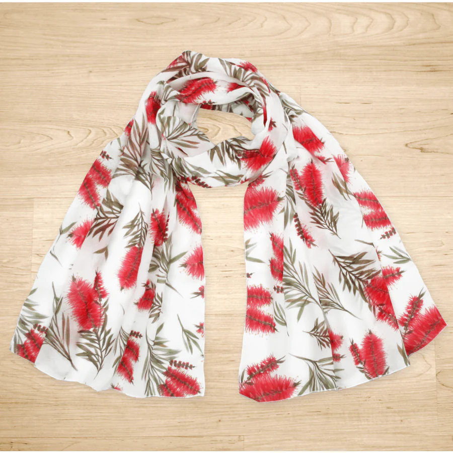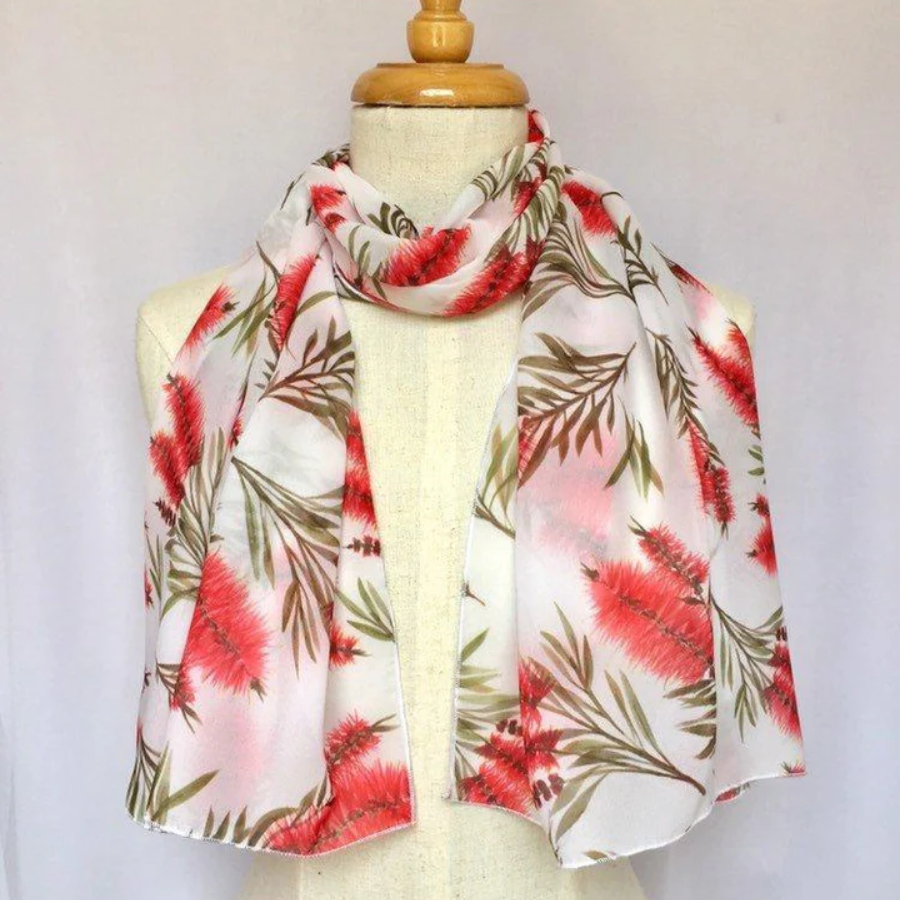 This beautiful scarf print has been designed from hand painted watercolour art work of Australian Botanical Bottlebrush flowers and has been hand crafted and packaged all in Bunbury Western Australia.