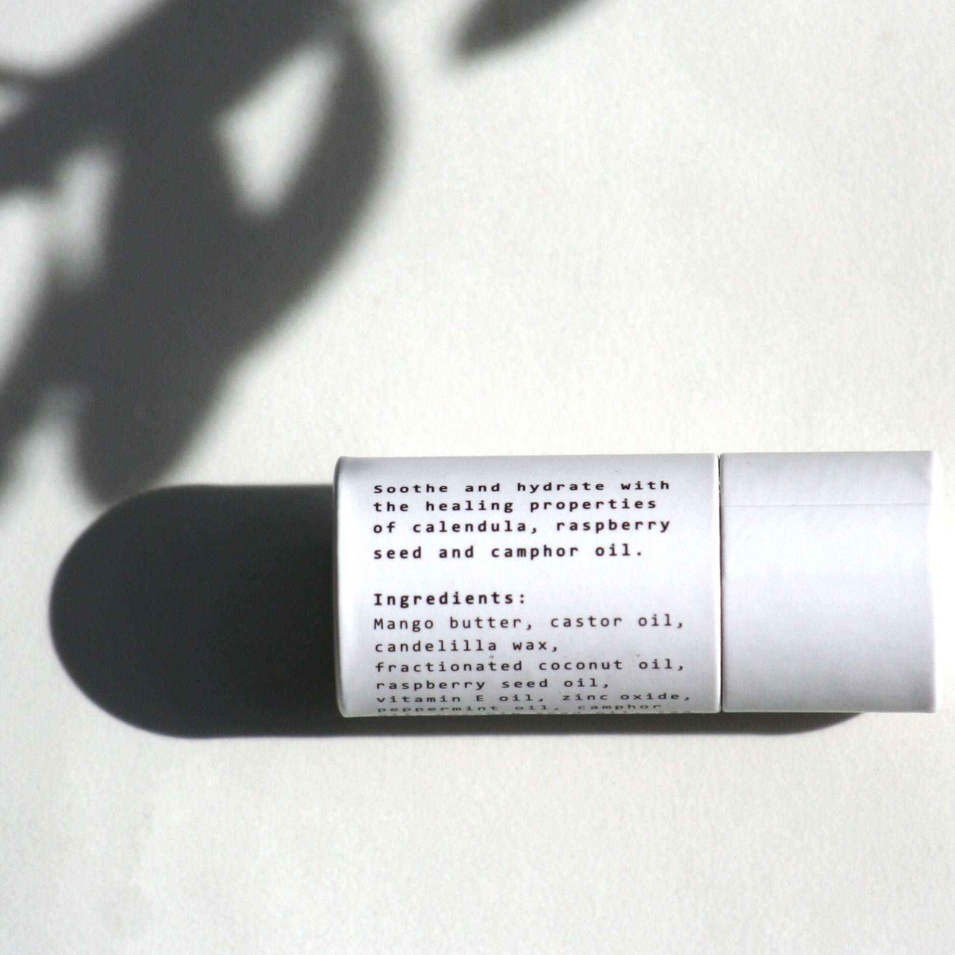 Theobroma Cacao (Cocoa) Seed Butter, Caprylic/Capric Triglyceride (Fractionated Coconut Oil), Ricinus Communis (Castor) Seed Oil, Euphorbia Cerifera Cera (Candelilla) Wax, Tocopheryl Succinate (Raspberry) Seed Oil, Tocopherol (Vitamin E Oil), Zinc Oxide, Mentha Piperita (Peppermint) Oil, Camphor Oil, Rosa Rubiginosa (Rosehip) Seed Oil, Hippophae Rhamnoides (Sea Buckthorn) Oil, Litsea Cubeba (May Chang) Fruit Oil, Simmondsia Chinensis (Jojoba) Seed Oil, Calendula officinalis (Calendula) Flower Extract.