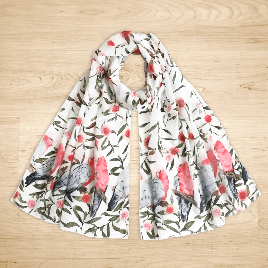 This beautiful scarf print has been designed from hand painted watercolour art work of Australian Pink and Grey Galah's with lovely pink Pin Cushion Hakea flowers.