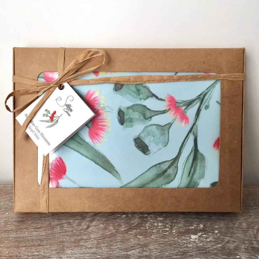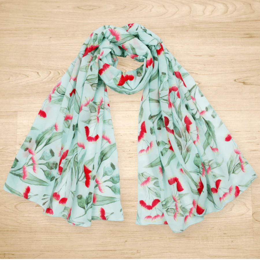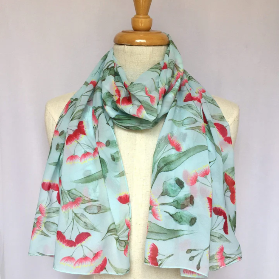 This beautiful scarf print has been designed from hand painted watercolour art work of Australian Eucalyptus Gum nuts and blossoms on a mint green/blue background and has been hand crafted and packaged all in Bunbury Western Australia.