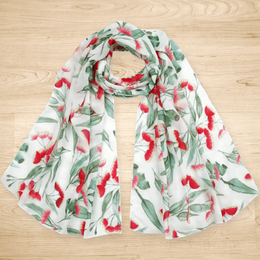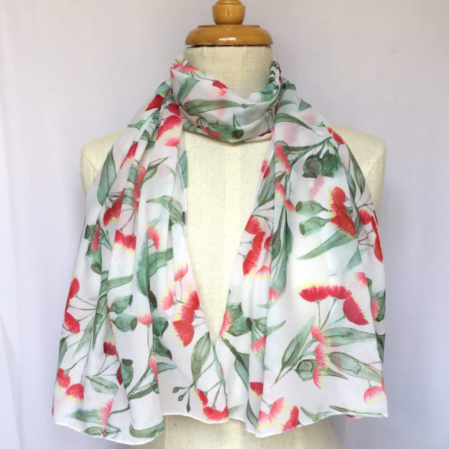 It is a rectangular scarf design and is made from a lovely soft, sheer chiffon fabric (100% polyester). It falls beautifully around your neck and would make the perfect Australian made gift for Mum, Grandma or anyone who loves our native Australian flora. It comes packaged in a beautiful clear window kraft gift box with an information card and raffia bow.