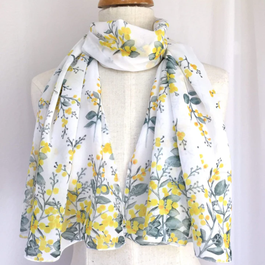 This beautiful scarf print has been designed from hand painted water colour art work of Australian Acacia podalyriifolia (Queensland Silver Wattle) flowers.